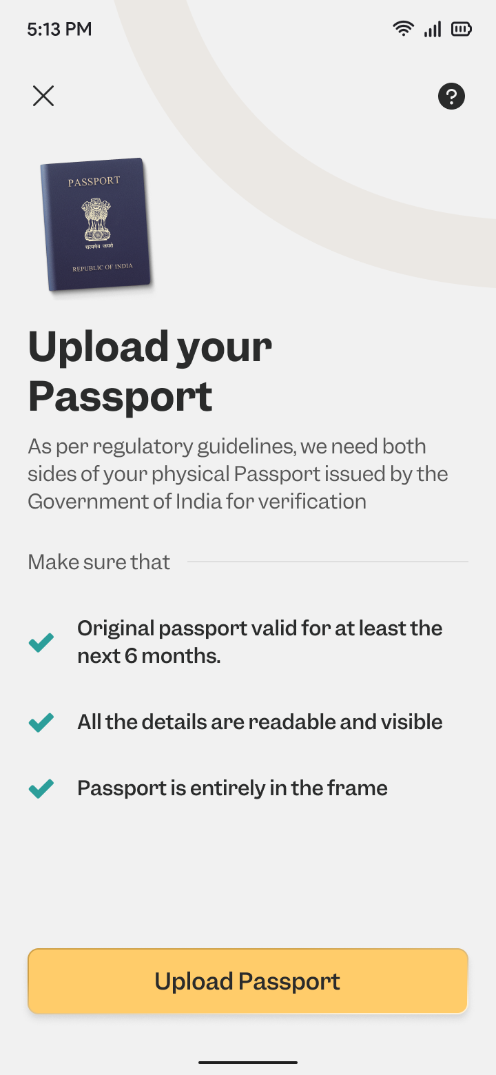 You can either take a photo of your passport, upload from gallery, or upload a pdf copy. You are required to upload both the front and back pages of the passport.