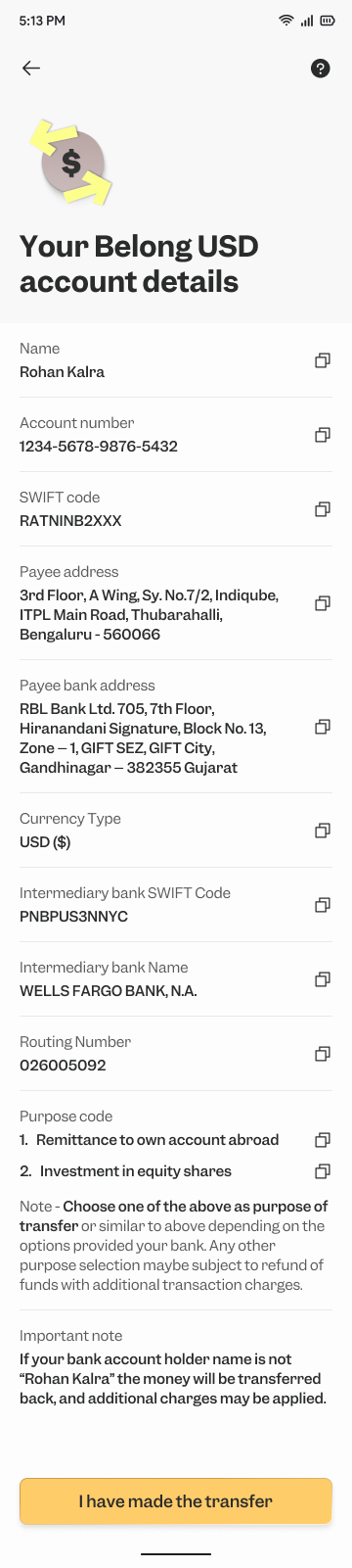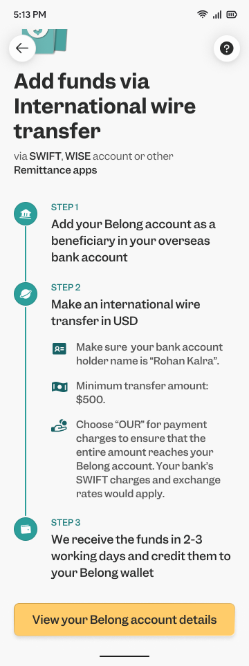 3. Your Belong wallet’s virtual account number, SWIFT code, and bank details will be displayed. Keep these details handy for adding the beneficiary in your UK bank.