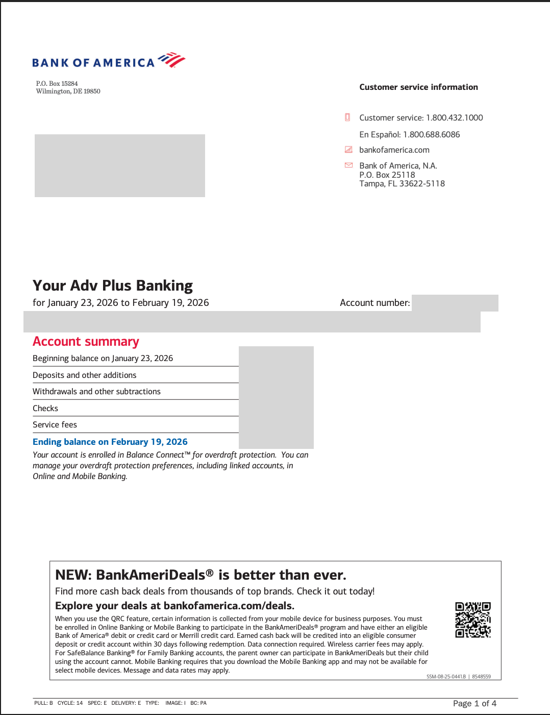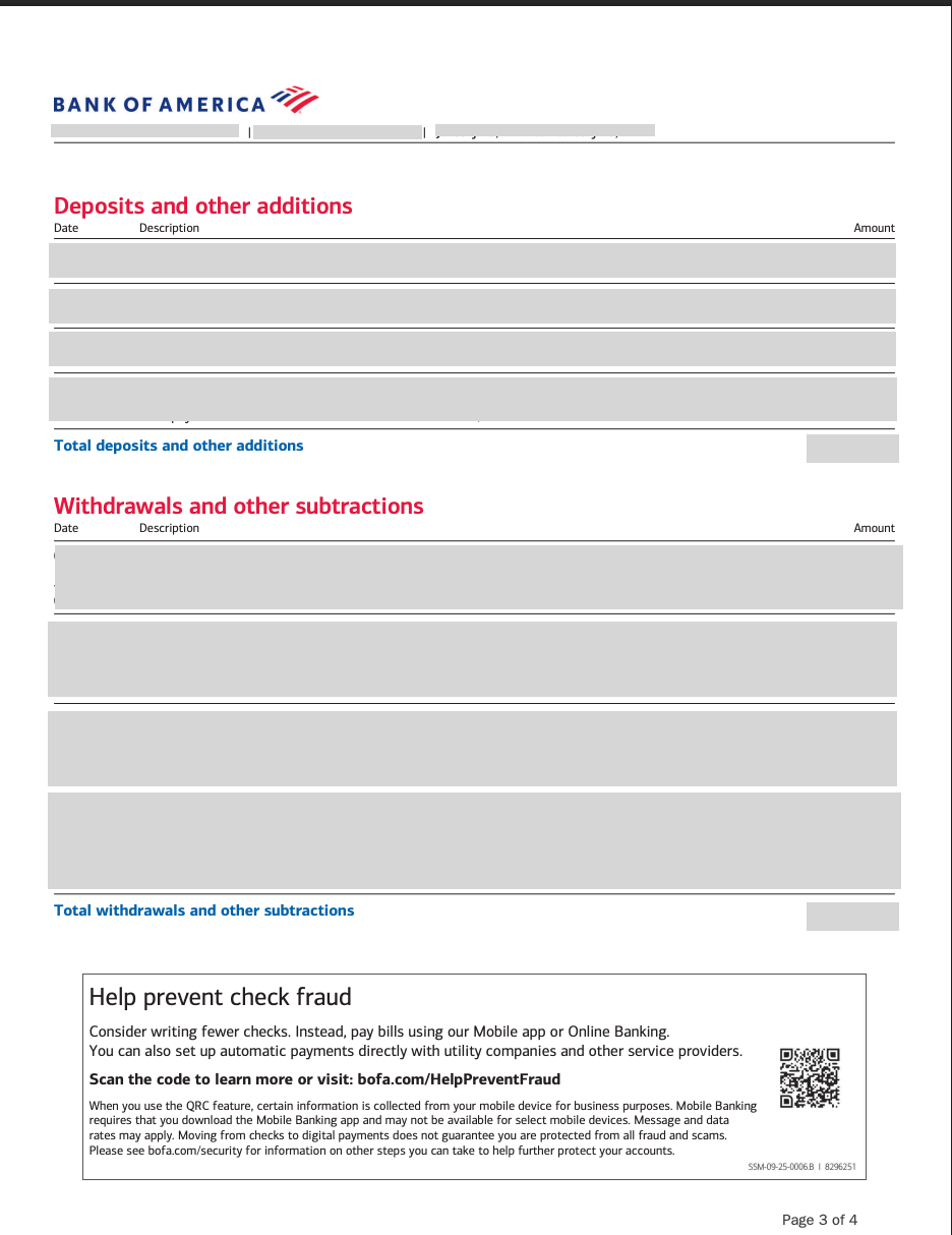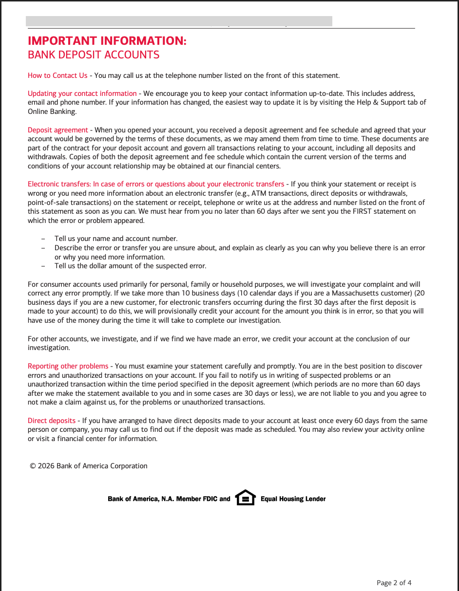 Sample bank statement - Bank of America account (USA)