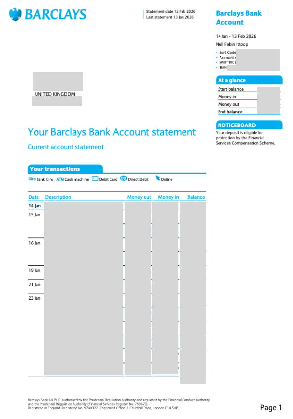 Sample bank statement - Barclays Bank (UK)