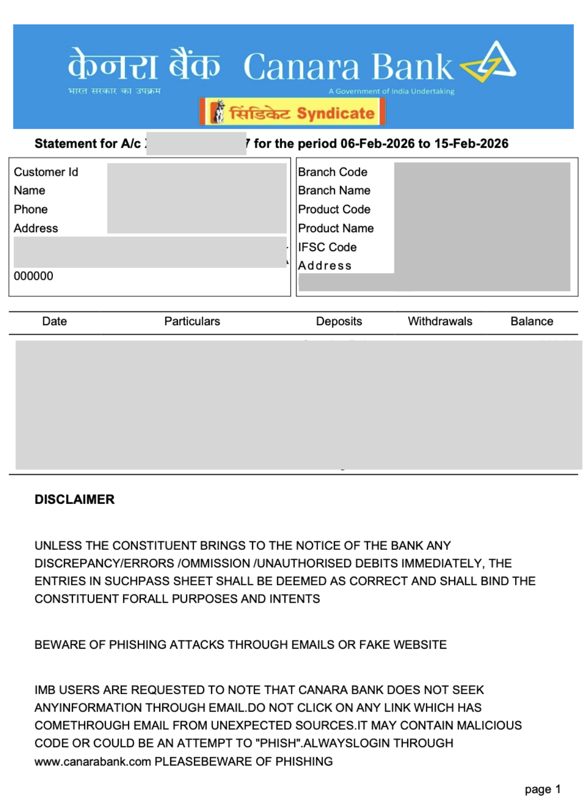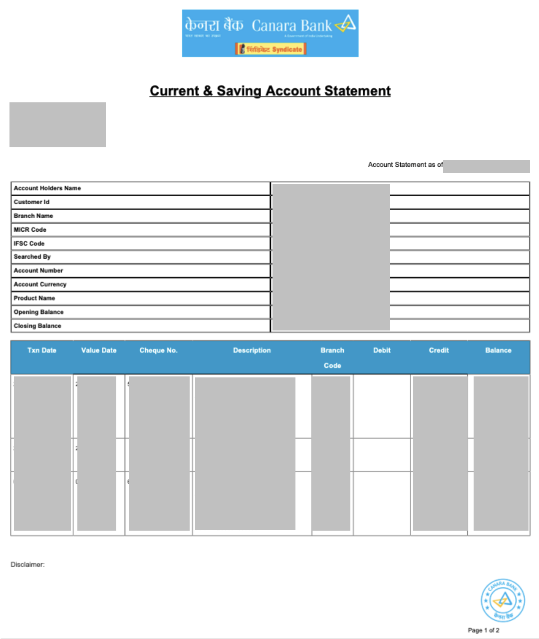 Sample bank statement - Canara Bank (NRE)