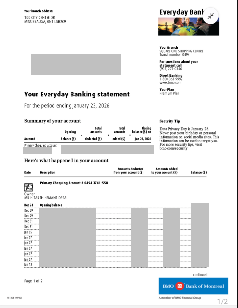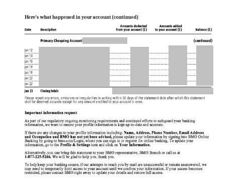 Sample bank statement - Bank of Montreal (Canada)