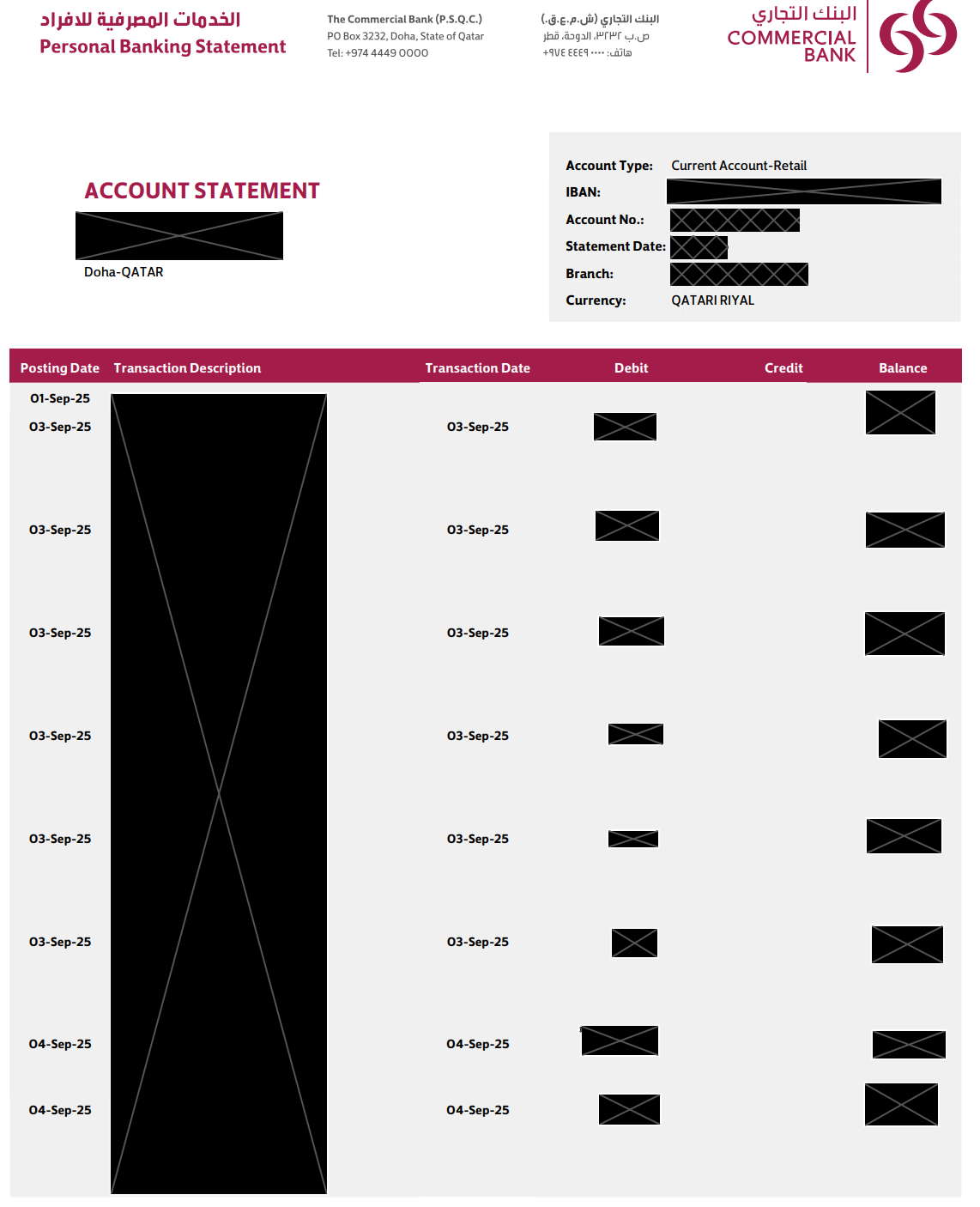 Sample bank statement for Commercial Bank of Qatar