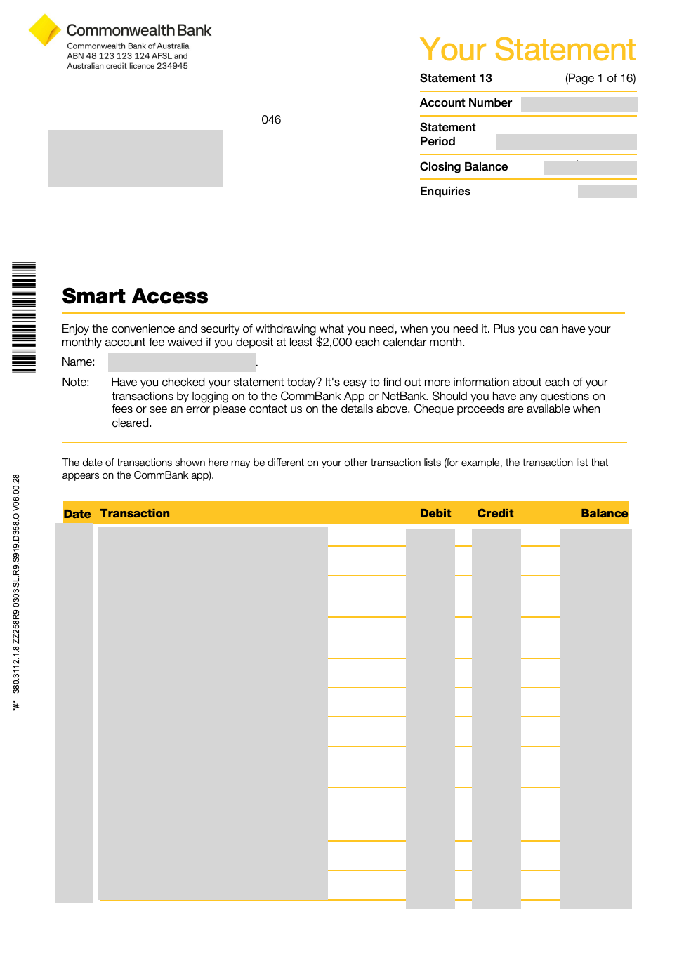 Sample bank statement - Commonwealth bank account (Australia)