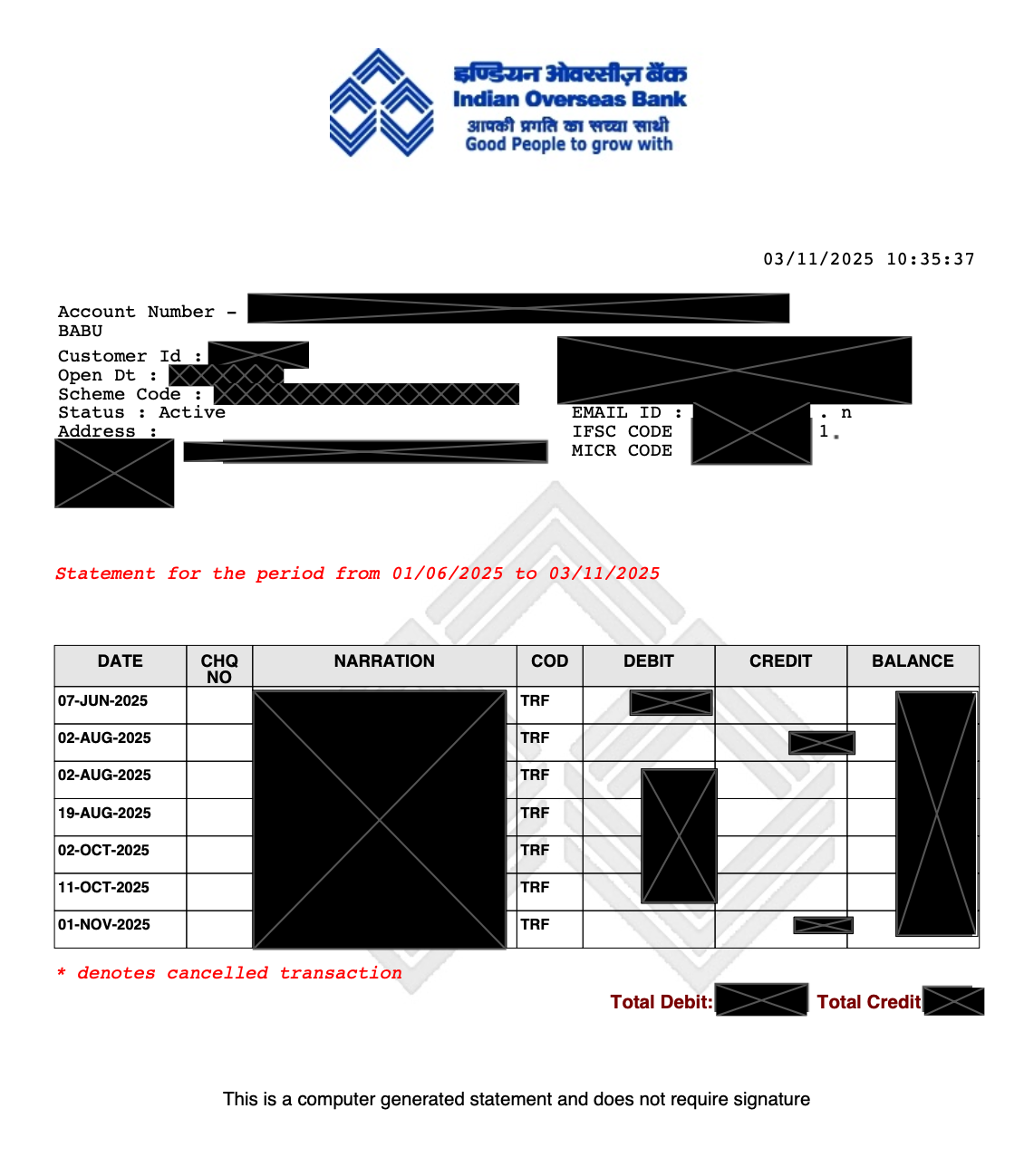 Indian Overseas Bank statement with transactions