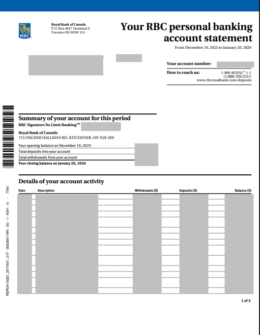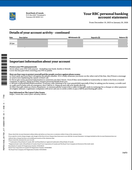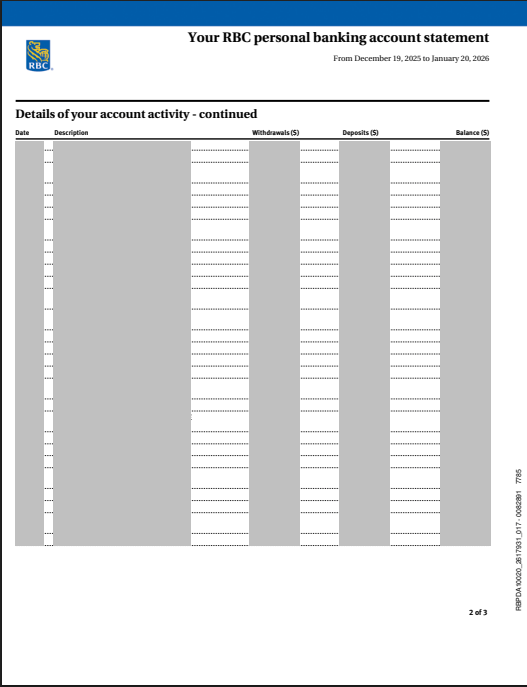 Sample bank statement - Royal bank of Canada (Canada)