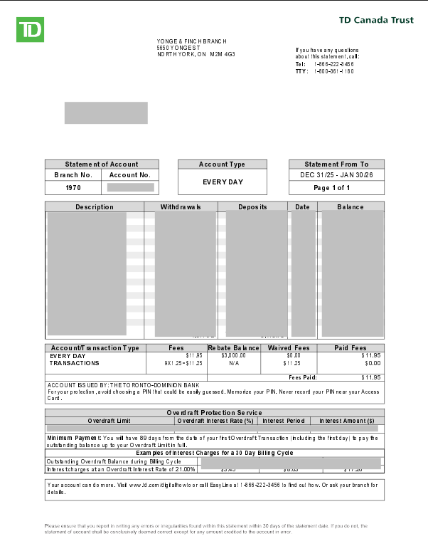 Sample bank statement - TD Canada Trust (Canada)