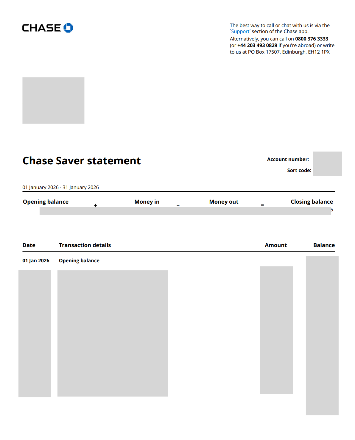 Sample bank statement - JP Morgan Chase Bank (UK)