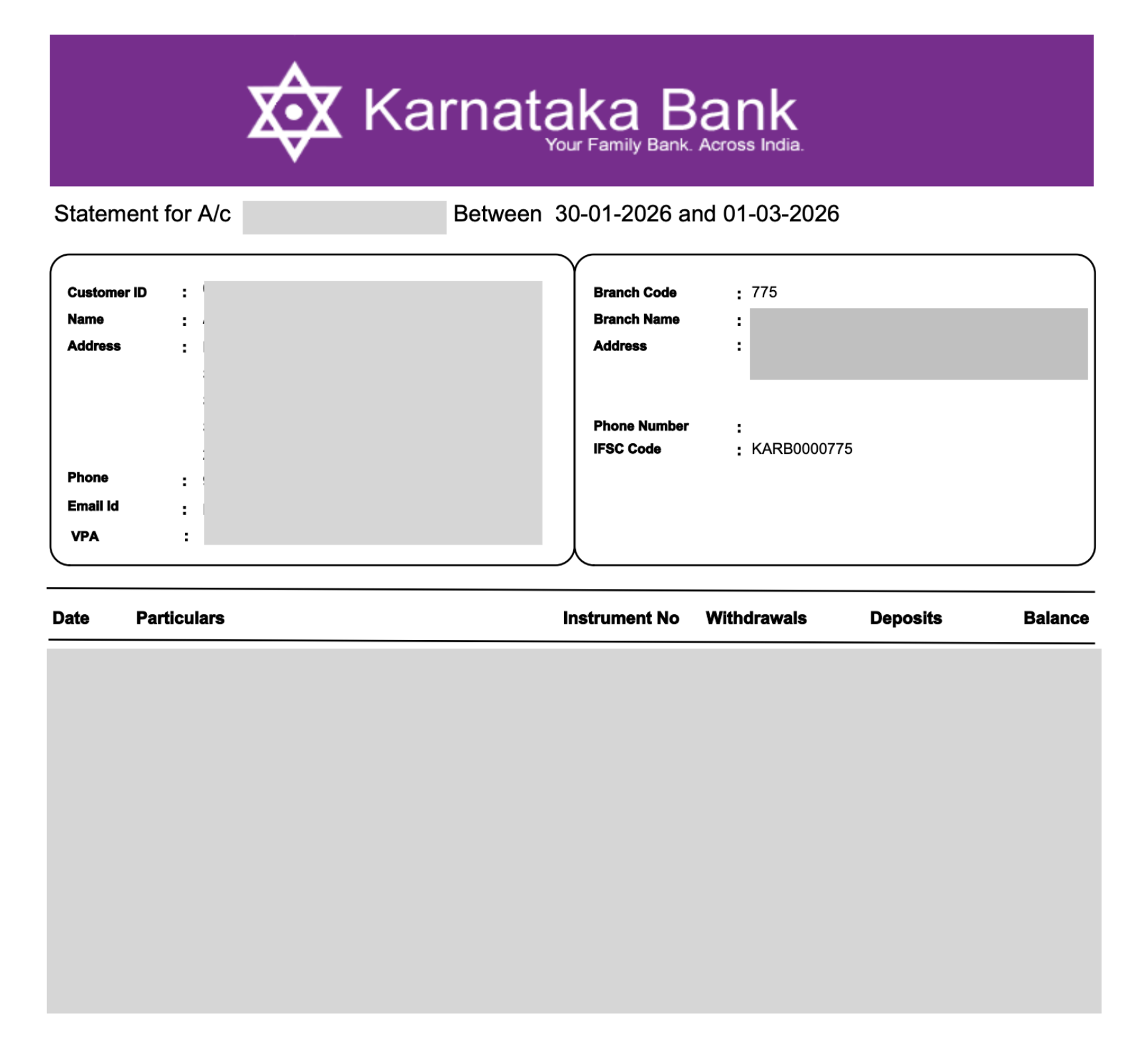 Sample bank statement - Karnataka Bank (NRE)