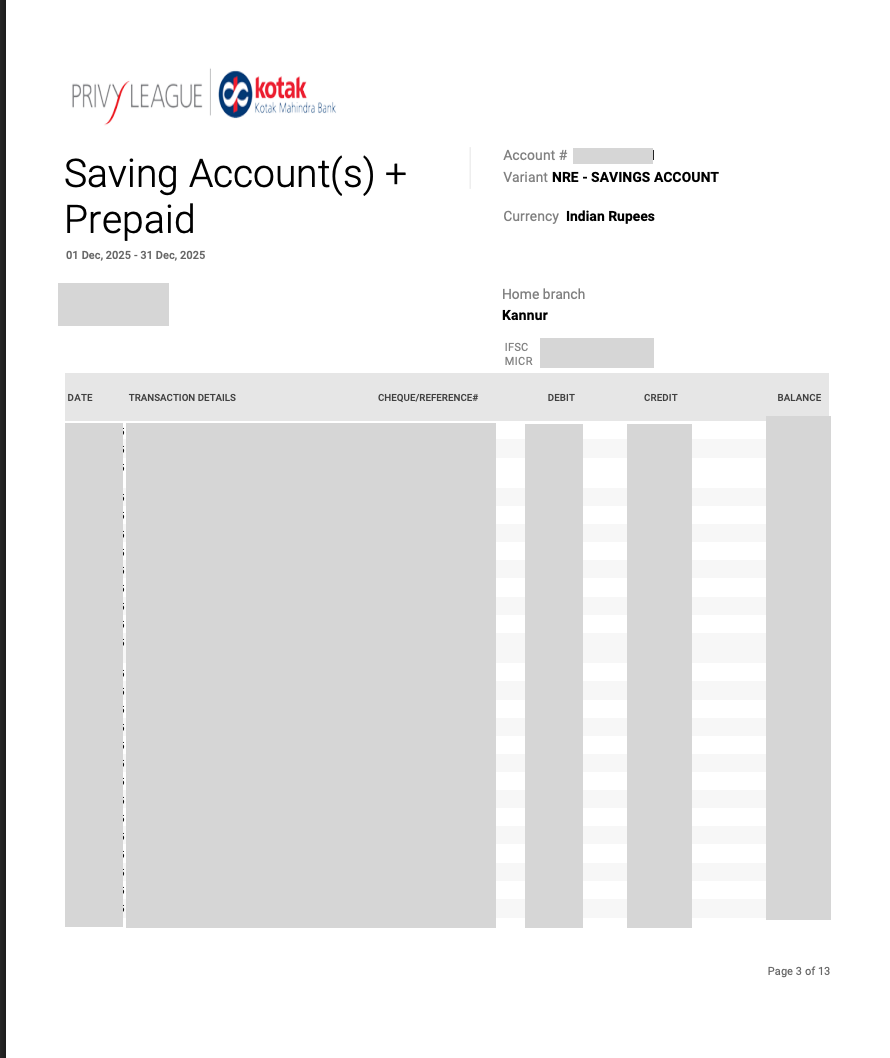 Sample bank statement - Kotak Mahindra Bank (NRE)